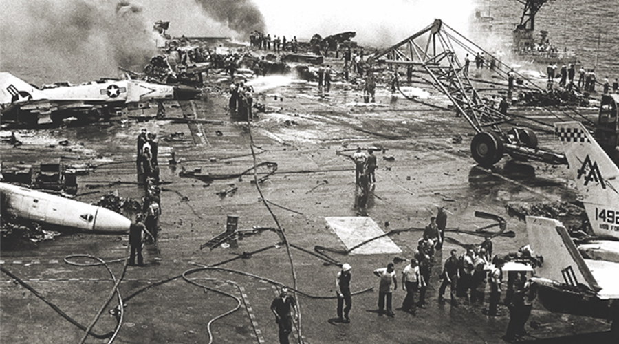 火災(zāi)一直是艦船的噩夢(mèng),不僅威脅到全體船員的安全,造成的連鎖反應(yīng)也是不可估量的。1951年-2008年美國(guó)航母發(fā)生火災(zāi)共計(jì)18次,最著名的是1967年福雷斯特號(hào)航空母艦的大火,其中有134名水手死亡,另有161人受傷。美國(guó)小鷹號(hào)航空1968年機(jī)庫(kù)外的儲(chǔ)藏室曾經(jīng)發(fā)生過(guò)火災(zāi),1969年美國(guó)企業(yè)號(hào)核動(dòng)力航母、福萊斯特號(hào)發(fā)生火災(zāi),1994年核動(dòng)力航母喬治華盛頓號(hào)同樣也應(yīng)為火災(zāi)引起了相當(dāng)嚴(yán)重的事故。2008年再次因火災(zāi)損失高達(dá)7000萬(wàn)美元等。